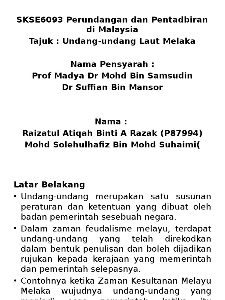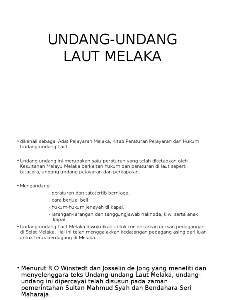Undang-Undang Laut Melaka Ebenezer DDanielsPengenalanUndang-Undang Laut MelakaUndang-Undang Laut Melaka diusahakan oleh beberapa nakhoda Melaka iaitu. The name of Sultan Mahmud Shah is mentioned. 1 Murid mengetahui maksud undang-undang antarabangsa.
